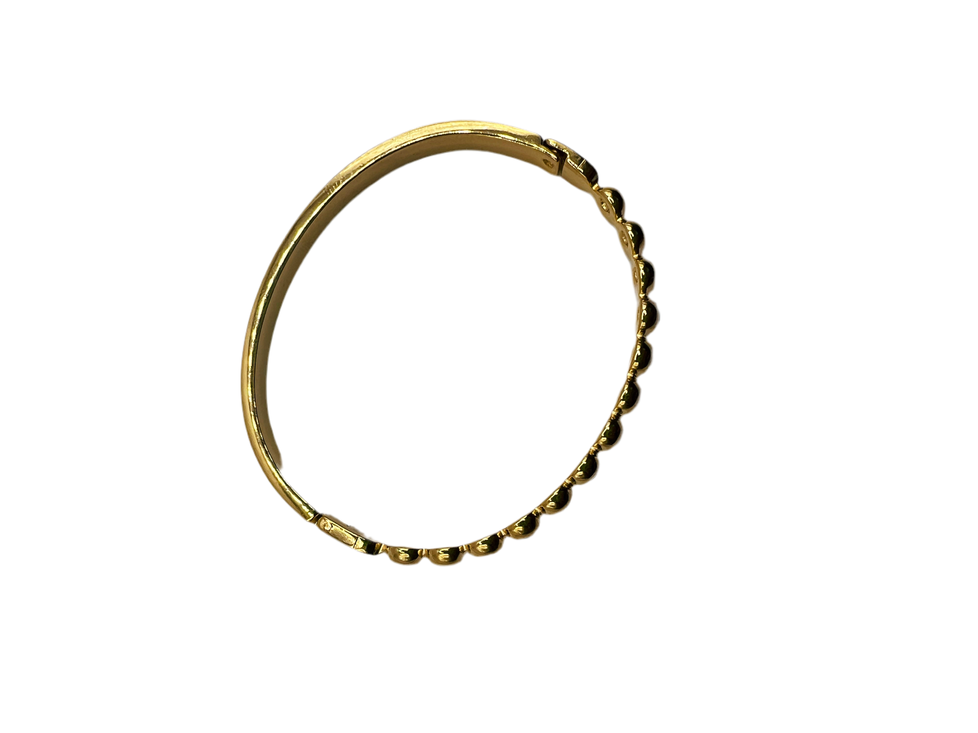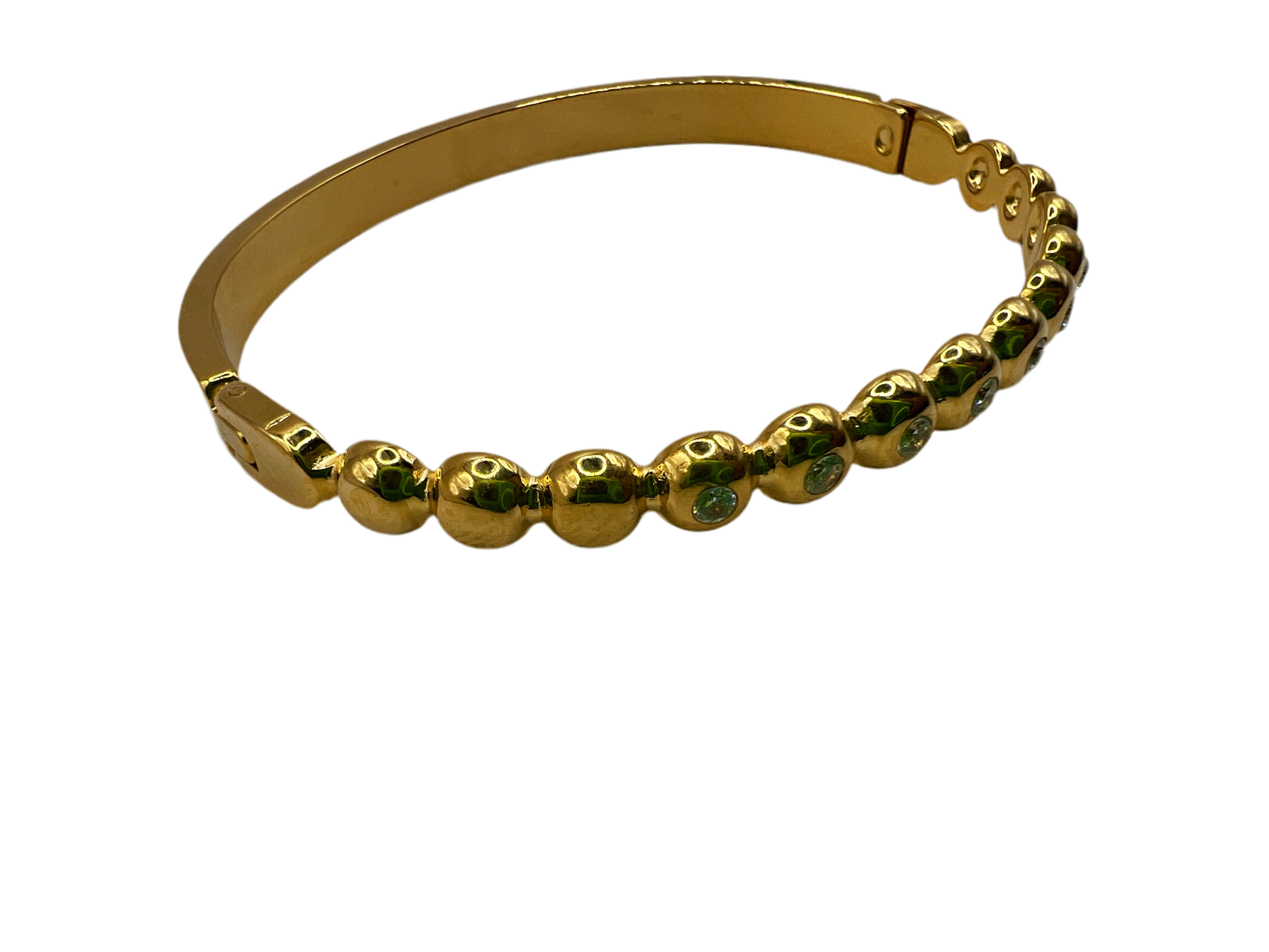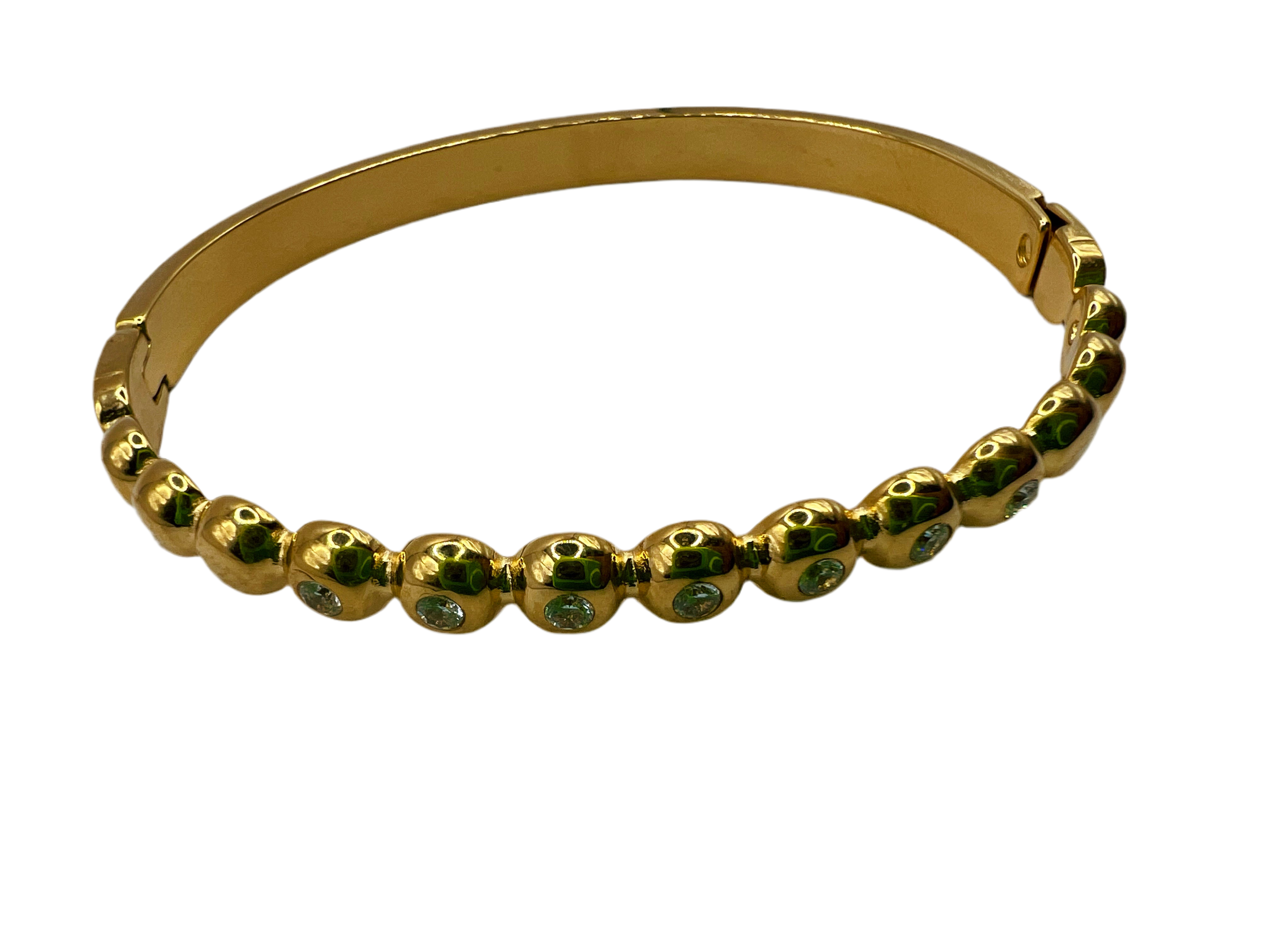 This stainless steel bracelet features circular shapes on the upper half, accented by a row of seven diamonds across the center. Designed for everyday wear, it also pairs beautifully with other bracelets for a layered look or can effortlessly elevate your ensemble for an evening event.