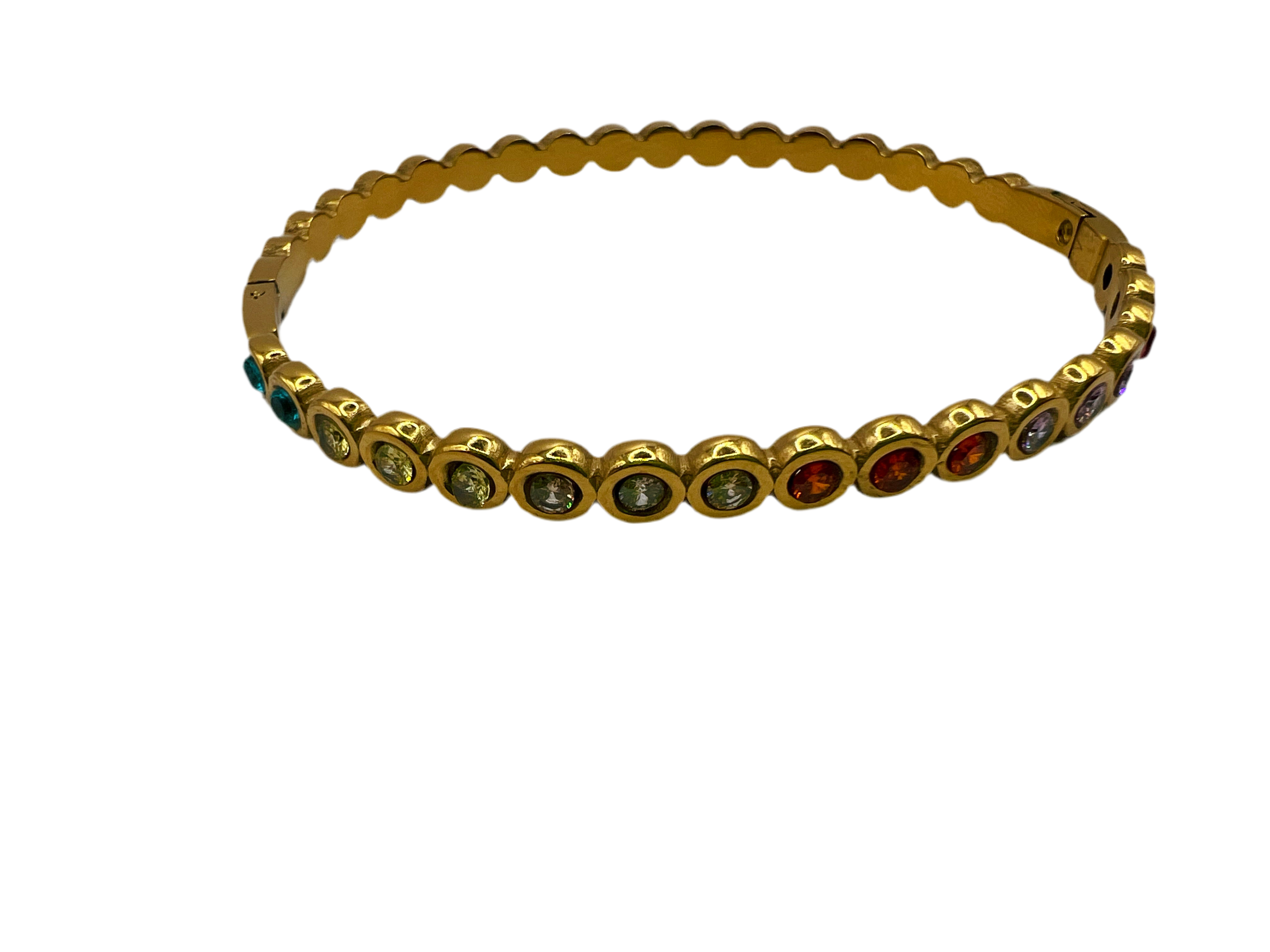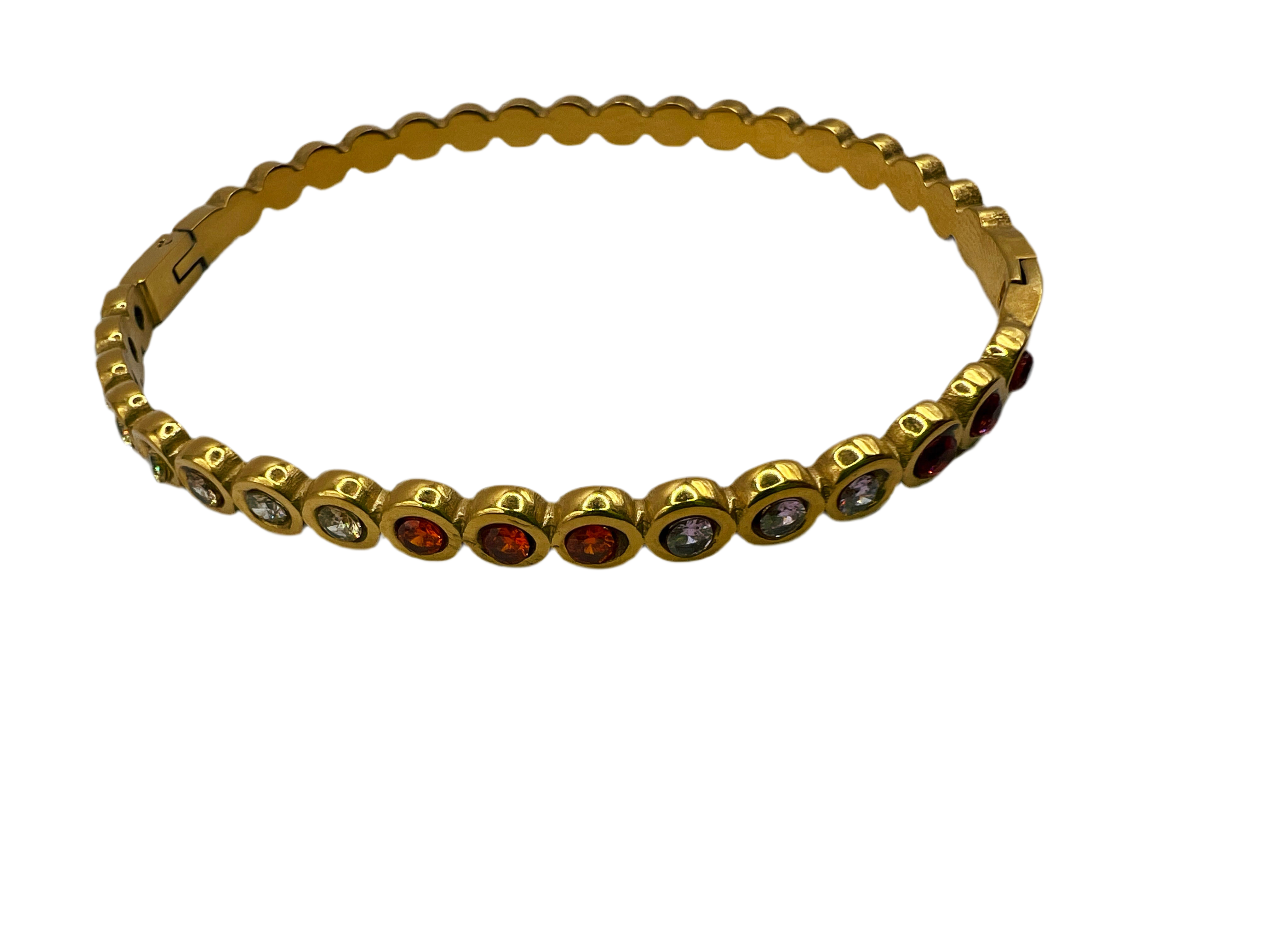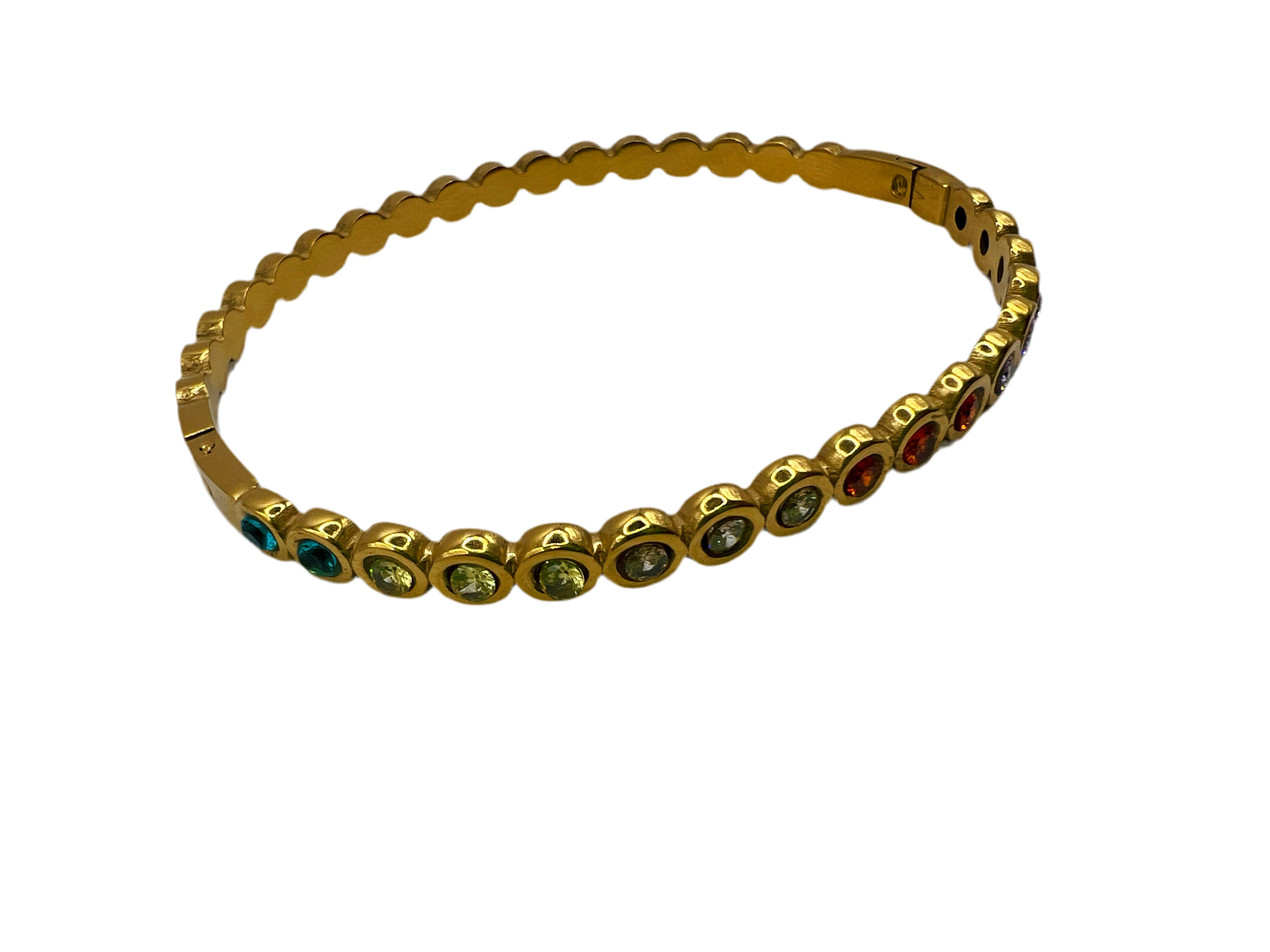 Crafted from durable stainless steel, the Tora bracelet combines an elegant design with practical wearability. Its top half features vibrant, colorful diamonds that add a refined touch while maintaining a lightweight feel. This piece serves as a striking statement accessory, perfect for elevating your daily ensemble with expert sophistication.