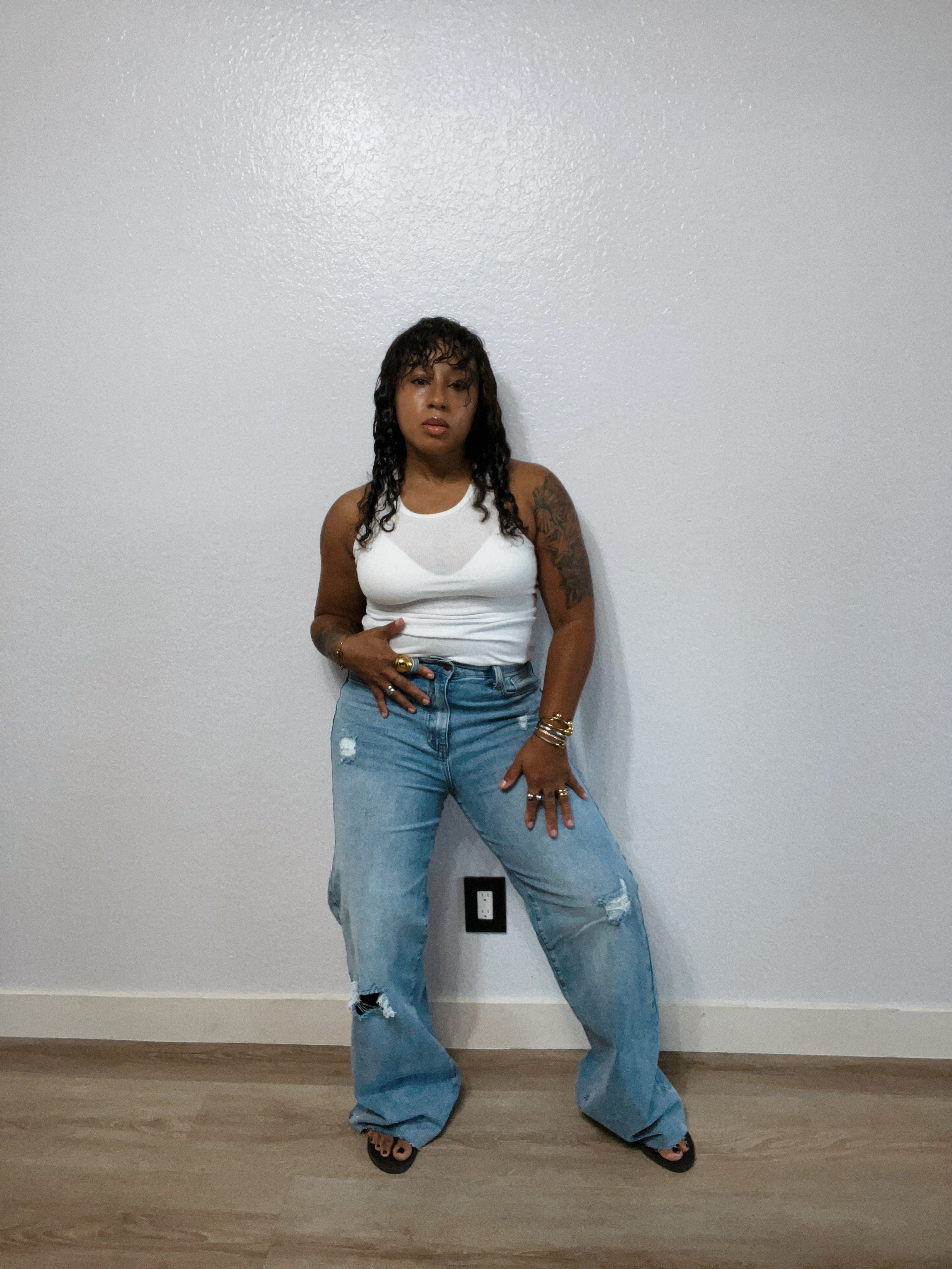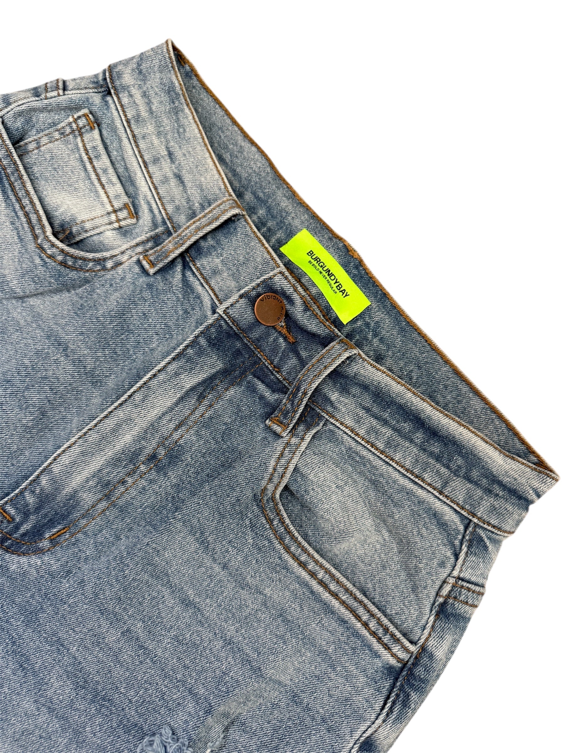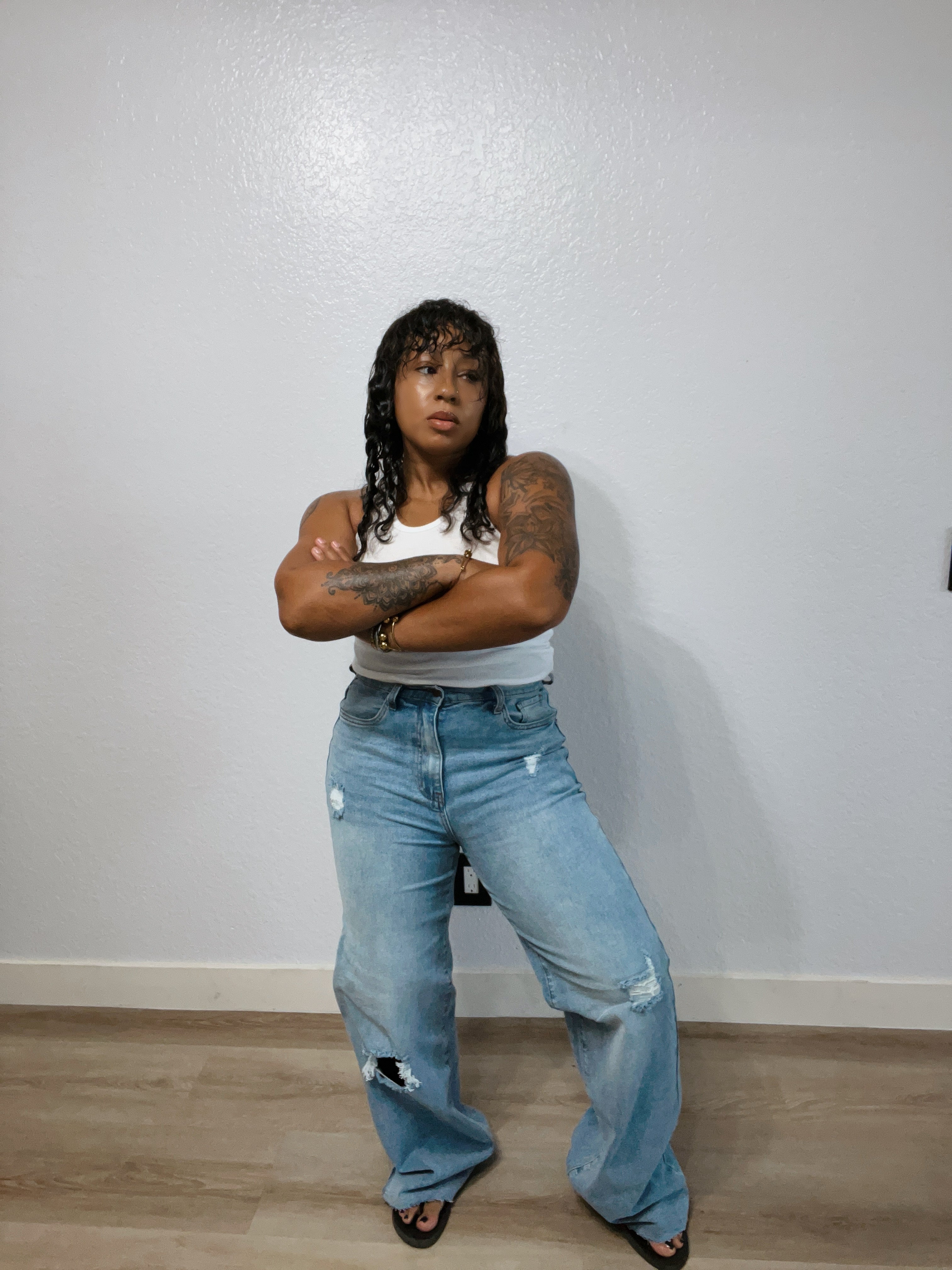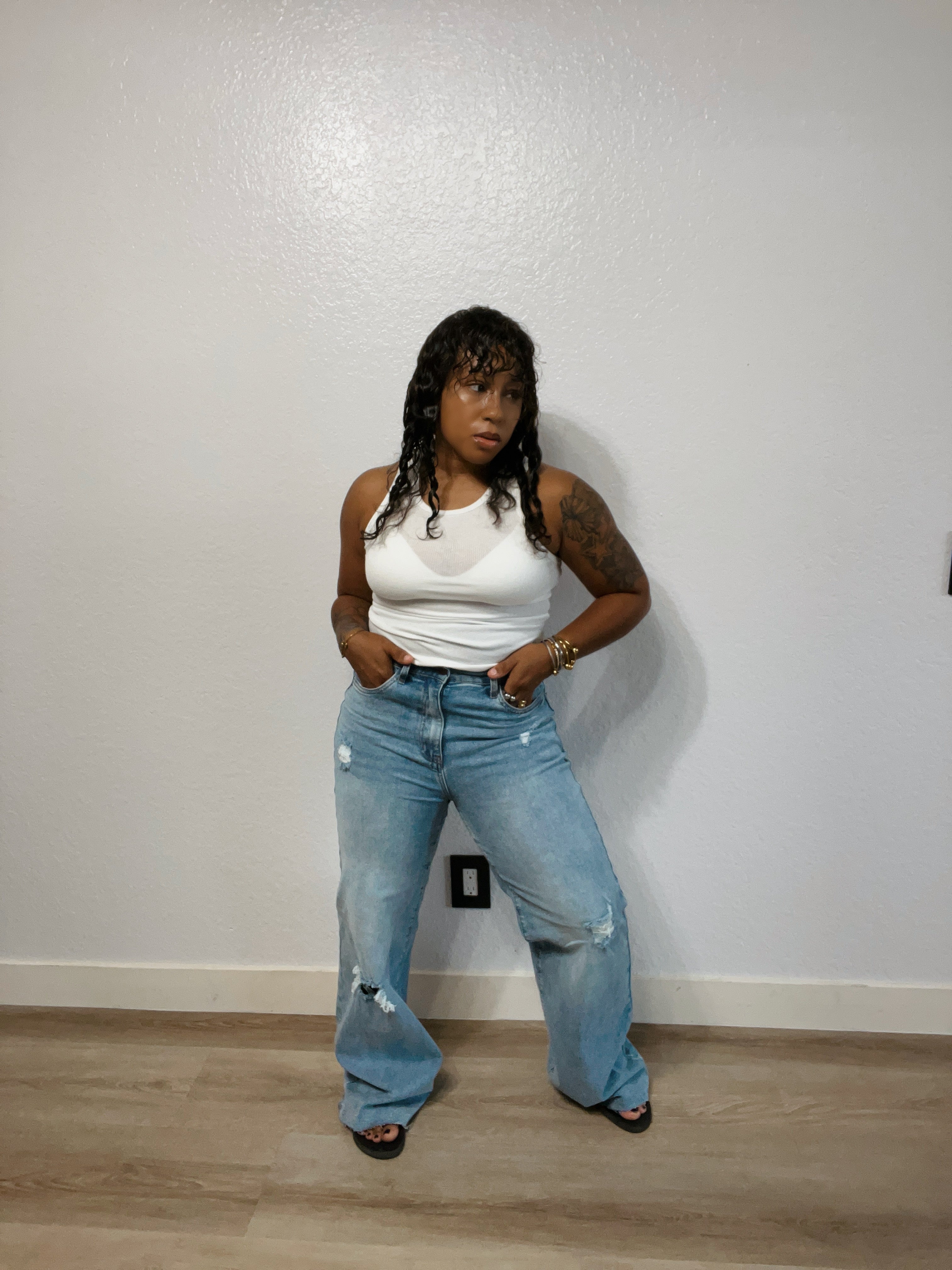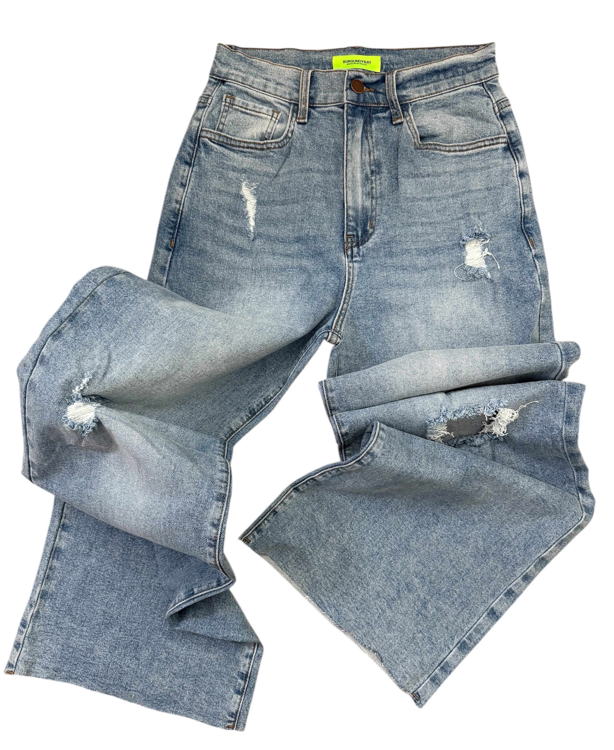 A pair of our 90s Baby Wide Jeans high-rise  fit featuring classic 5-pocket construction, small distressed details, raw edge hem, and zip-fly closure. (3) Rise: 12", Inseam: 33" Model is 5'1" and wearing a size 7